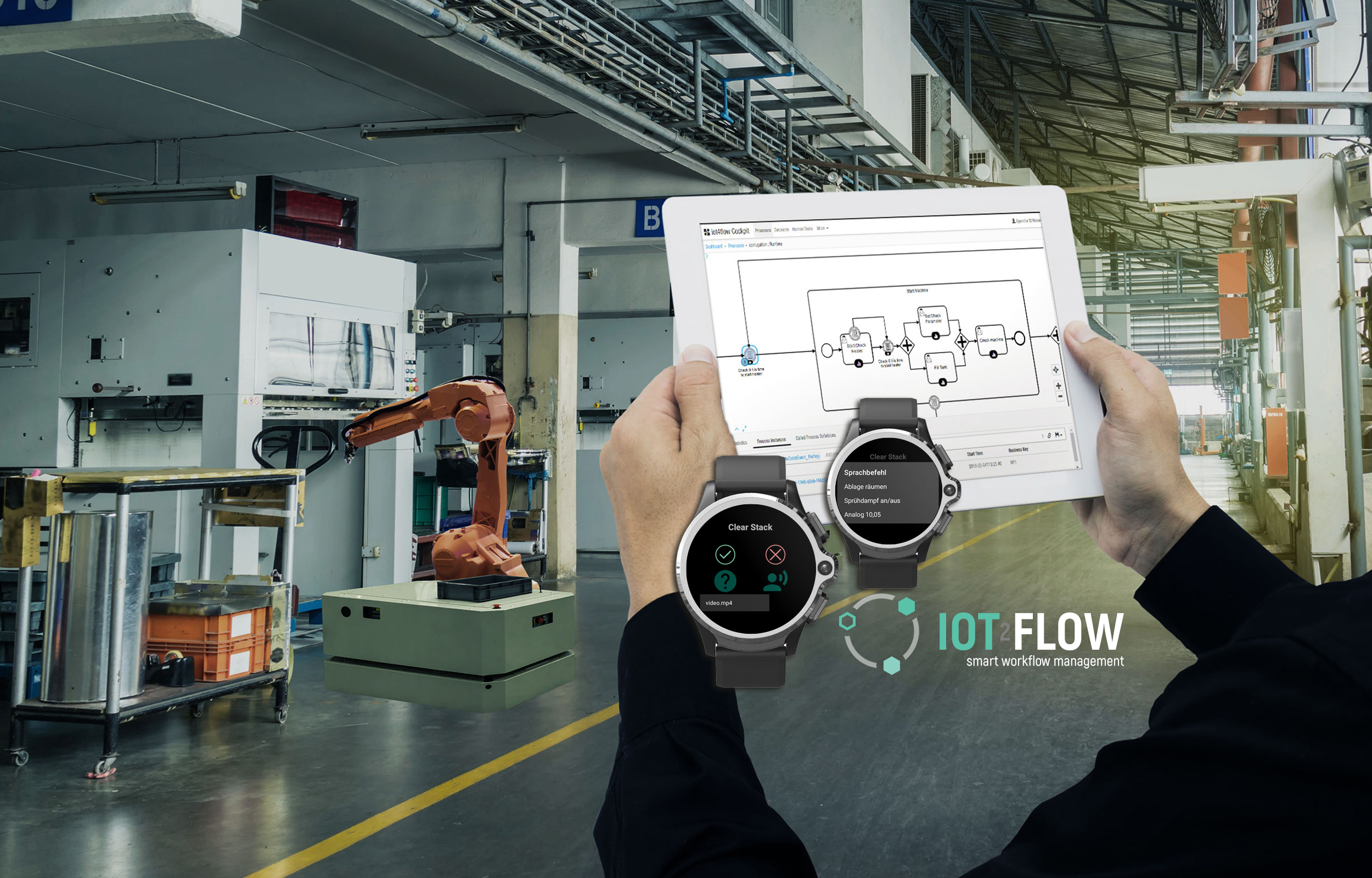 Graphische Modellierung und Ausführung von Arbeitsabläufen, gesteuert von Sensordaten. Flexible Aufgabenzuteilung und Benutzerführung mittels Smartwatches.